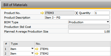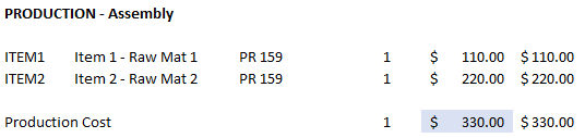 Assembly Production Order is raised that consumed 1 ITEM1 and 1 ITEM 2 raw material component.