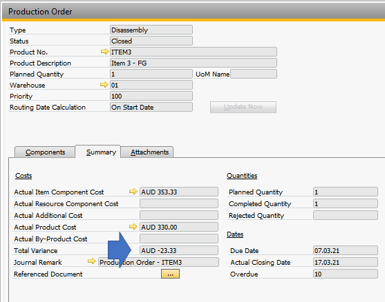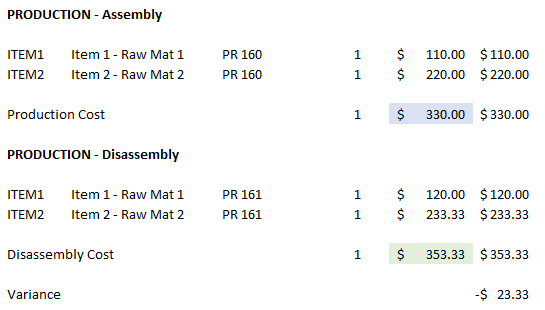 When disassembly of the prior the production order, it will calculate the variance between the old and new cost.