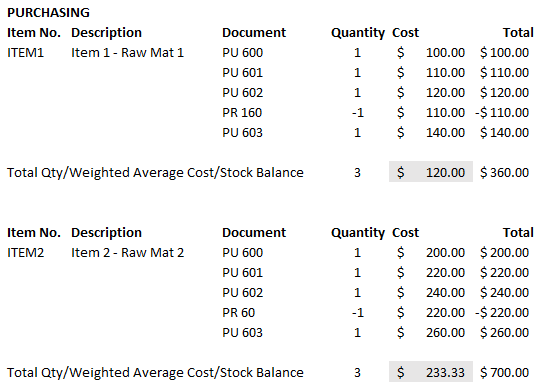 Assume there are multiple purchase of ITEM1 and ITEM2 with various cost. Below is a computed weight average cost for components.