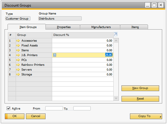 Setup a 'Customer Group' Discount Group, by 'Item Groups' discount 25% for 'Distributor' customer group.