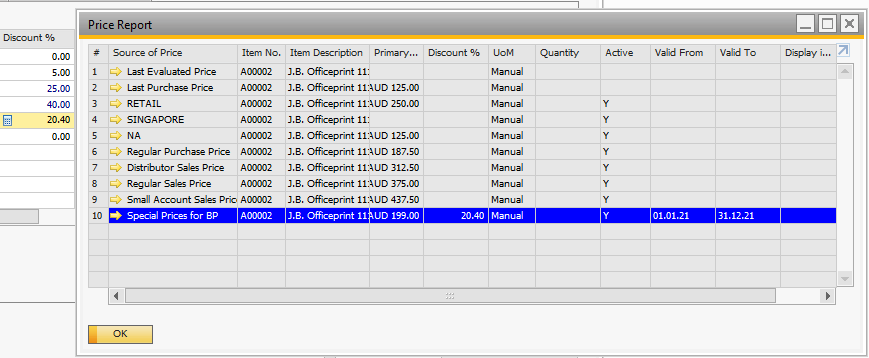Discount and special price will display in Sales document according to the highest number of price # defined as below.
