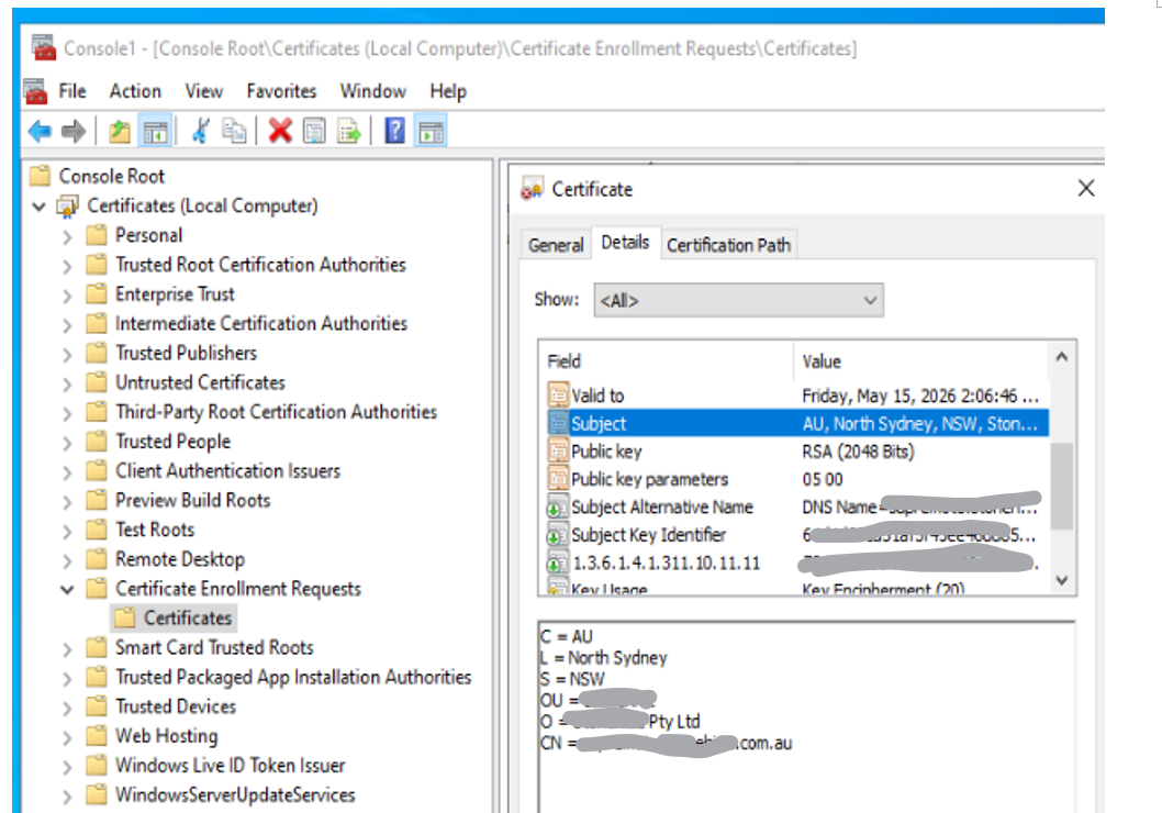 10. Open MMC Certificate Snap-In and verify your Certificate Enrolment Request is there and information are correct: