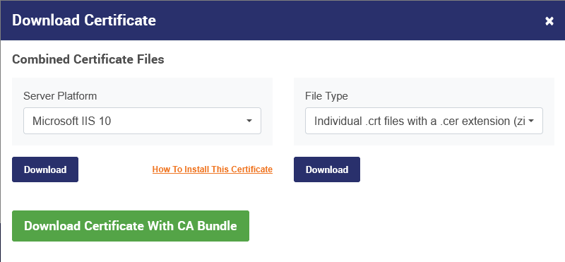 6. Download copy of the certificate with file type "individual .crt files with .cer extensions (zipped)"